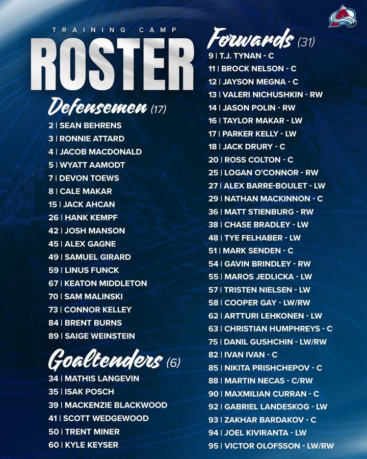 The Colorado Avalanche released their 54-player training camp roster (31 forwards, 17 defensemen, and 6 goaltenders). On-ice sessions begin on Thursday, Sept. 18 at Family Sports.