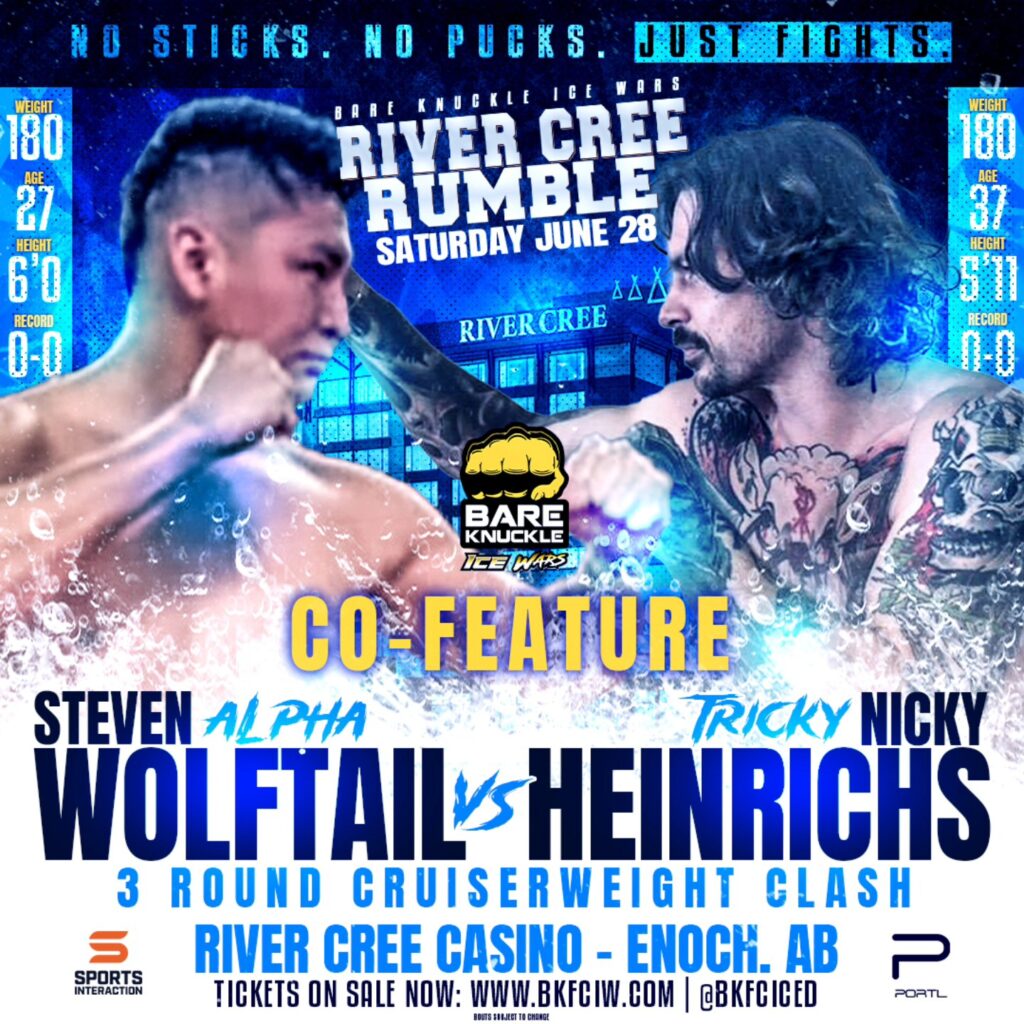 On the heels of the Battle of Border in Michigan, BKFC Ice Wars is headed for Enoch, Alberta on June 28. The event is dubbed the “River Cree Rumble”. Combatants include cruiserweights Steven “Alpha” Wolftail versus Nicky Heinrichs.