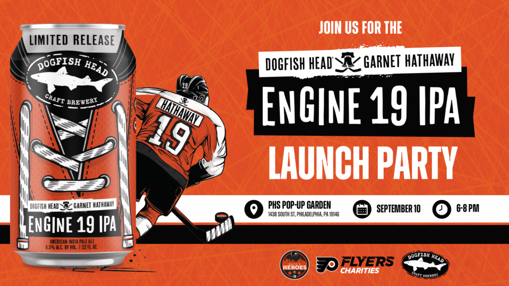 Veteran Flyers winger Garnet Hathaway and his wife Linday hosted and Engine 19 IPA launch party on Wednesday in conjunction with the Flyers. Dogfish Head Co-Founder and Head Brewer Sam Calagione also attended the event on Wednesday evening at HS Pop Up Garden at South Street in Philadelphia. A portion all sales go to support local first responders via the player’s Hath’s Heroes program the Hathaways created in tandem with Flyers Charities. The beer will be available locally including at XFinity Mobile Arena.