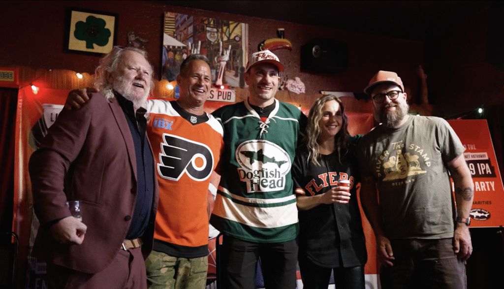 Garnet and wife Lindsay Hathaway joined Flyers Charities and Dogfish Head Craft Brewery to host a private tasting event for family, friends, and staff. Guests enjoyed exclusive tastings along with a fireside chat with Dogfish Head Co-Founder & Head Brewer Sam Calagione, Brewing Manager Bryan Selders, and the Hathaways. Hathaway’s Flyers teammates Bobby Brink and Travis Sanheim were among the attendees.